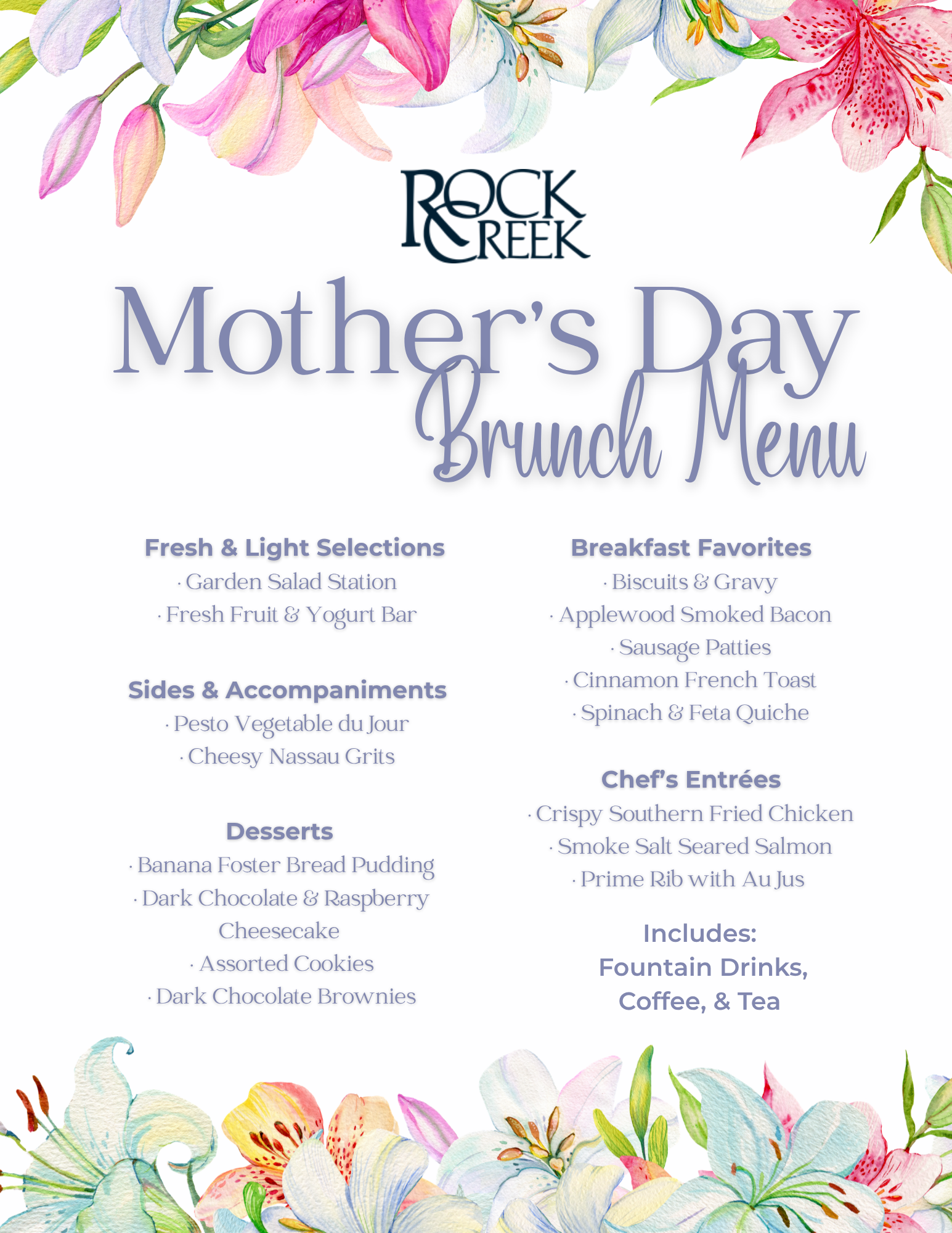 Celebrate Mom with a beautiful brunch experience at Rock Creek! Enjoy a delicious buffet filled with chef-crafted favorites and refreshing drinks. The perfect way to show your appreciation and make her day extra special.